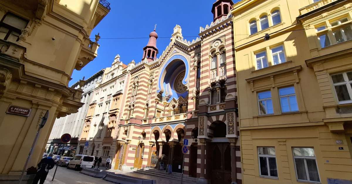 À quelques pas de la gare principale de Prague, dans la rue Jeruzalémská, se trouve la synagogue du Jubilé, également connue sous le nom de synagogue de Jérusalem, qui est l'une des synagogues les plus importantes et les plus belles de Prague. Des arches mauresques distinctives, une rosace, des rayures de pierre rouges et blanches et de nombreuses couleurs illuminent toute la rue Jeruzalemska.
